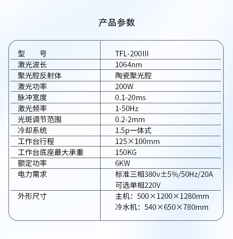 TFL-200Ⅲ型模具激光焊機是通發激光公司在TFL-180Ⅲ的基礎進行了改良,采用通發自主研發的二代精密單燈電源為燈泵浦驅動電源,配置觸摸屏,操作更方便。主機具備激光頭手搖升降與工作臺按鈕電動升降實現焊接不同厚度模具的激光焊加工。本款機型更適用于各類高精密注塑模具激光補焊,精密塑膠模具零件激光修補,塑膠模具鈹銅零件激光燒焊;可對模具使用過程中出現的磨損進行激光修復;對機械加工失誤、電火花加工失誤,模具減膠設計變更等需要對模具修改,起到關鍵的作用,可彌補因加工失誤造成的巨大損失。