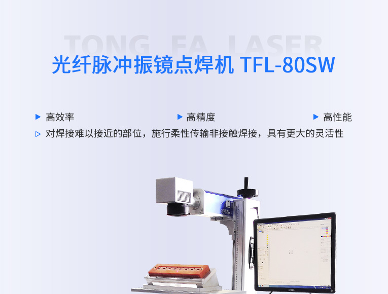 通發(fā)激光TFL-80SW振鏡激光焊接機,采用主振蕩器功率放大 MOPA(Masrer Qscillator Power Amplifier)結構,實現(xiàn)脈沖寬度和頻率獨立可調(diào)的特點,在對脈寬和頻率進行改動的情況下仍保持較高且穩(wěn)定的峰值功率輸出,適用于電池、小五金等多個行業(yè)的激光打標、激光焊接應用。